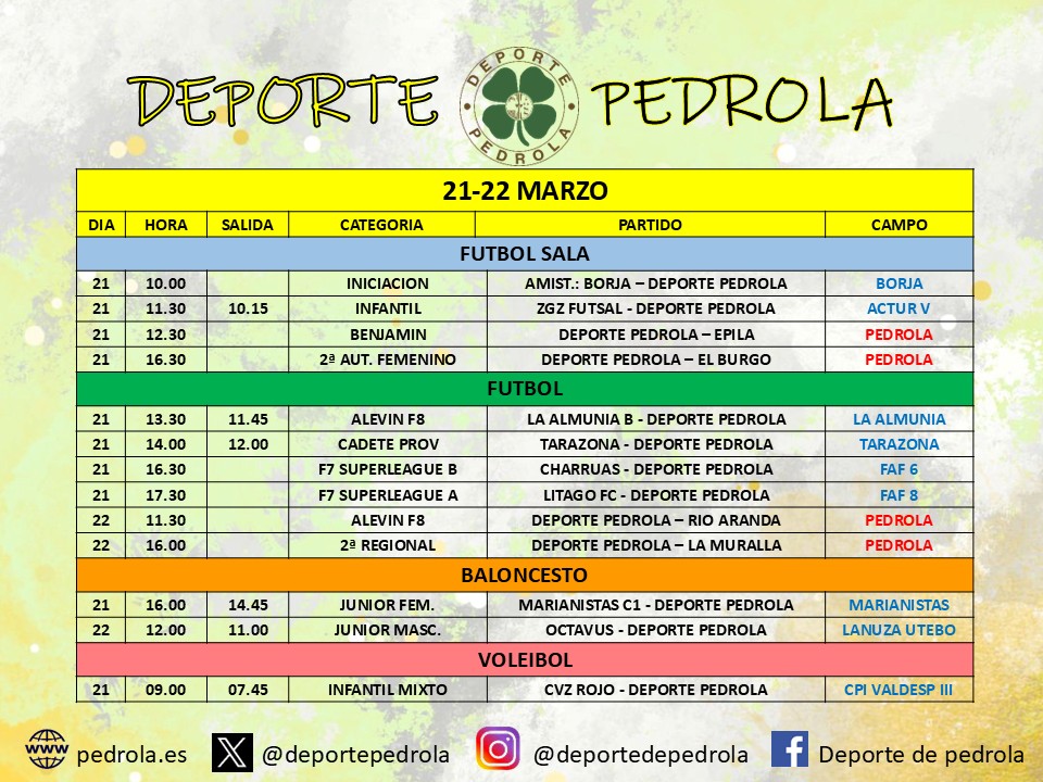 Horarios de competición Deporte Pedrola que se celebran del 21 al 22 de marzo