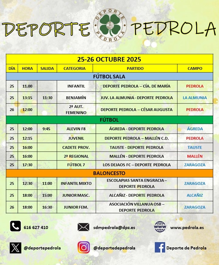 El servicio de deportes anuncia los horarios de competición de Deporte Pedrola que se celebran del 25 al 26 de octubre de 2025.