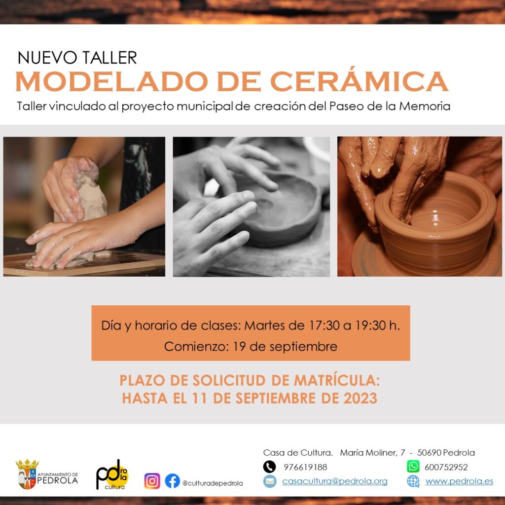 La Concejalía de Cultura del Ayuntamiento de Pedrola incluye en su oferta cultural para el curso 2023-2024 un nuevo taller de Modelado de Cerámica.